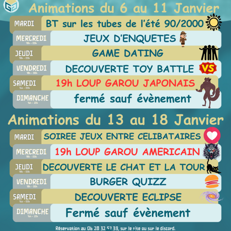 Toute l’équipe du GG se joint à moi pour vous souhaitez une merveilleuse année 2026. On repart sur deux semaines d’animations à venir :Les soirées débutent à 20h sauf pour les loups garous (à 19h). Durant nos animations, vous pouvez librement jouer à nos jeux de la ludothèques si vous le souhaitez.La réservation (DM, sms, […]