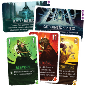 Dans votre deck et celui de votre adversaire, exactement les mêmes cartes : 16 personnages disposant d’une influence allant de 1 à 16 et de pouvoirs liés à leur faction. La Rebellion (vert) appauvrit le jeu de votre adversaire en lui faisant défausser des cartes de sa main ou de son deck. La Dynastie (bleu) vous donne (ou vous rend) l’avantage en manipulant l’issue des combats. L’Académie (jaune) use de magie pour transformer les éléments en présence, mais aussi ceux des duels passés et futurs. Enfin la Guilde (rouge) booste ou réduit l’influence de vos personnages pour inverser l’issue d’un combat.